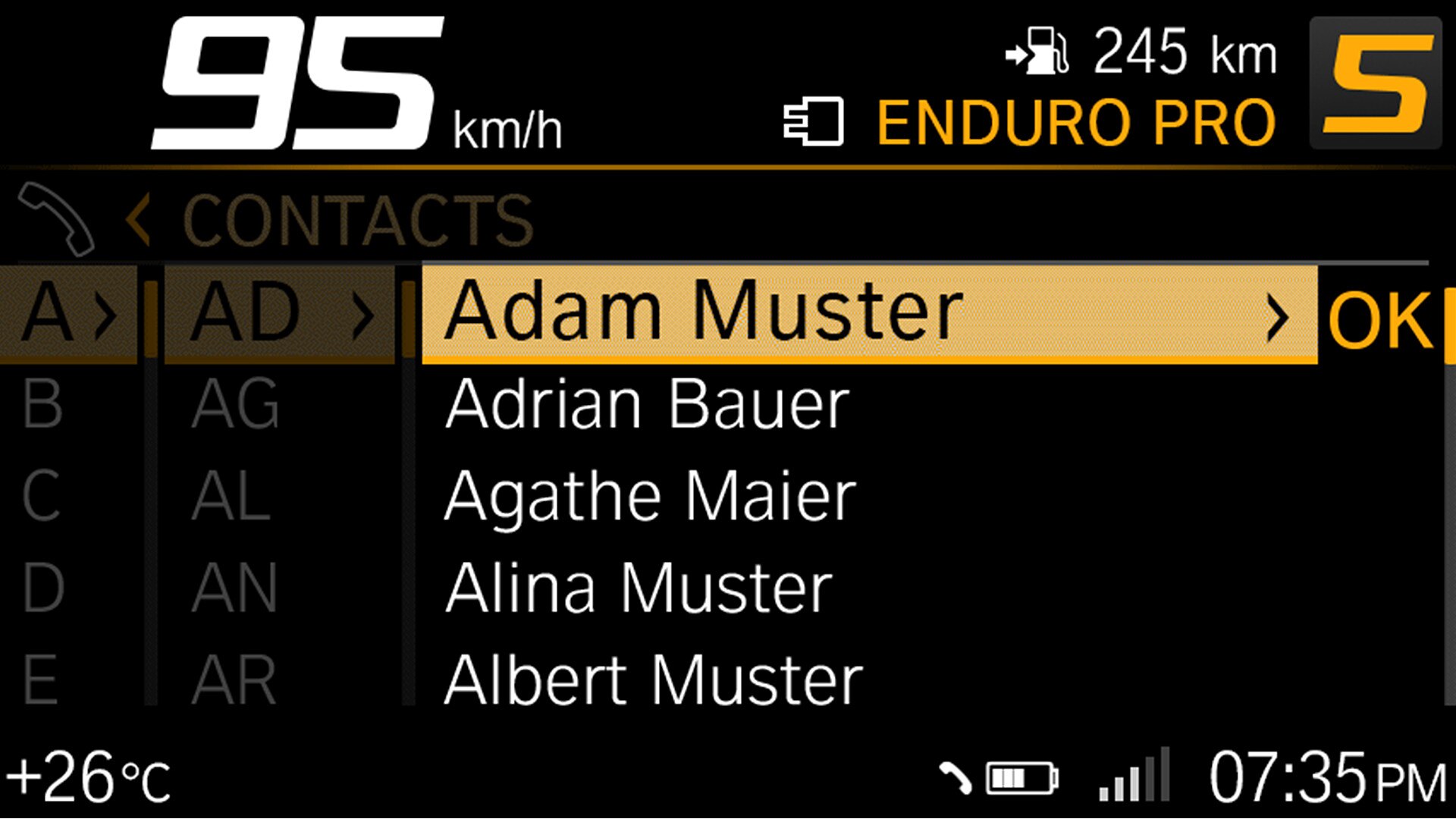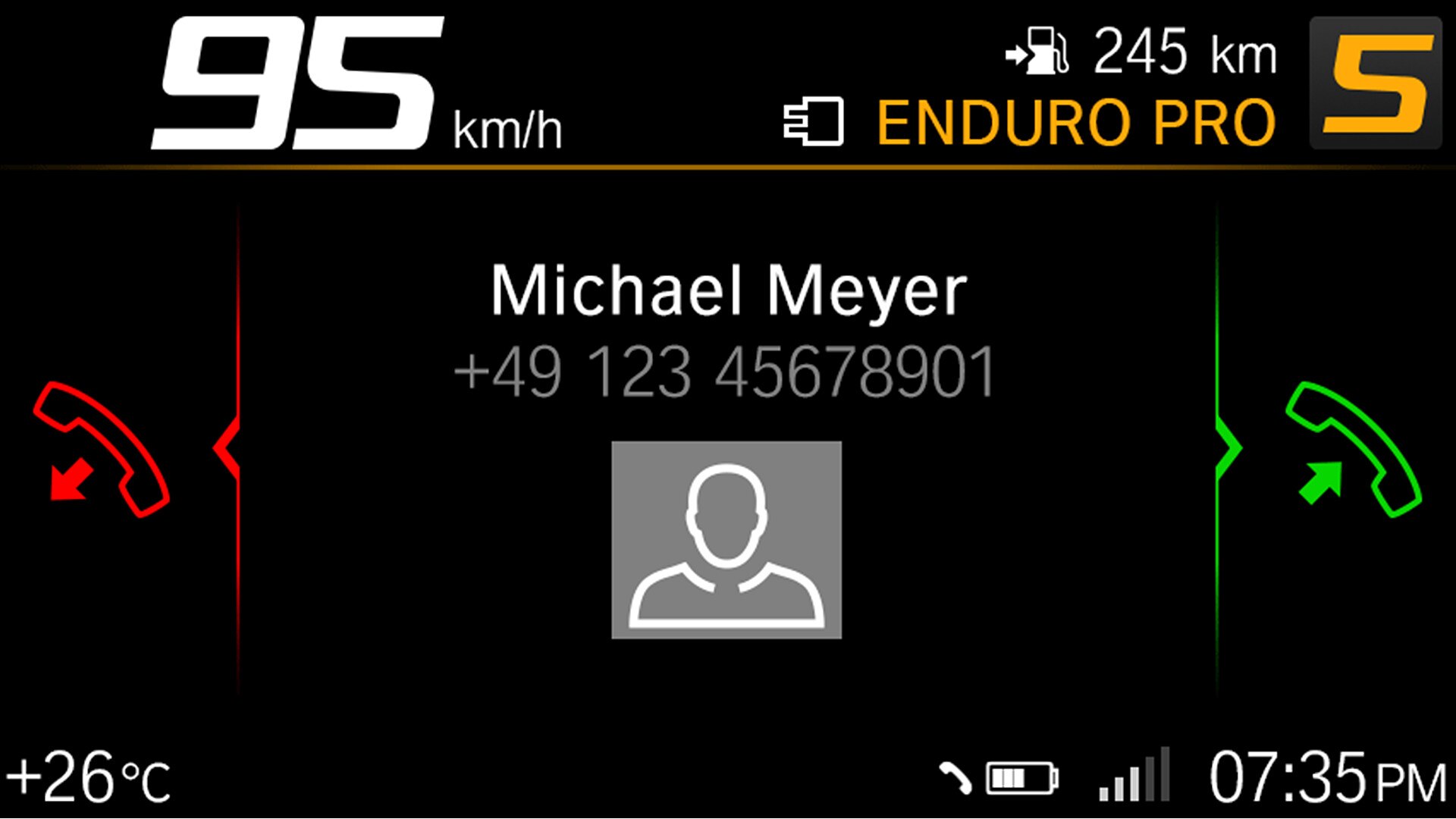 The combination of a helmet with BMW Motorrad communications system and the Connectivity optional accessory allows you to make phone calls during your journey. The rider has full access to his smartphone's contact list using the TFT-display and can select and call contacts via the multi-controller. Incoming calls are also shown on the display and can be accepted or declined with a simple hand movement. Riding-related information such as speed and gear are visible on the clear display at all times thanks to the unique BMW Motorrad visual display concept.