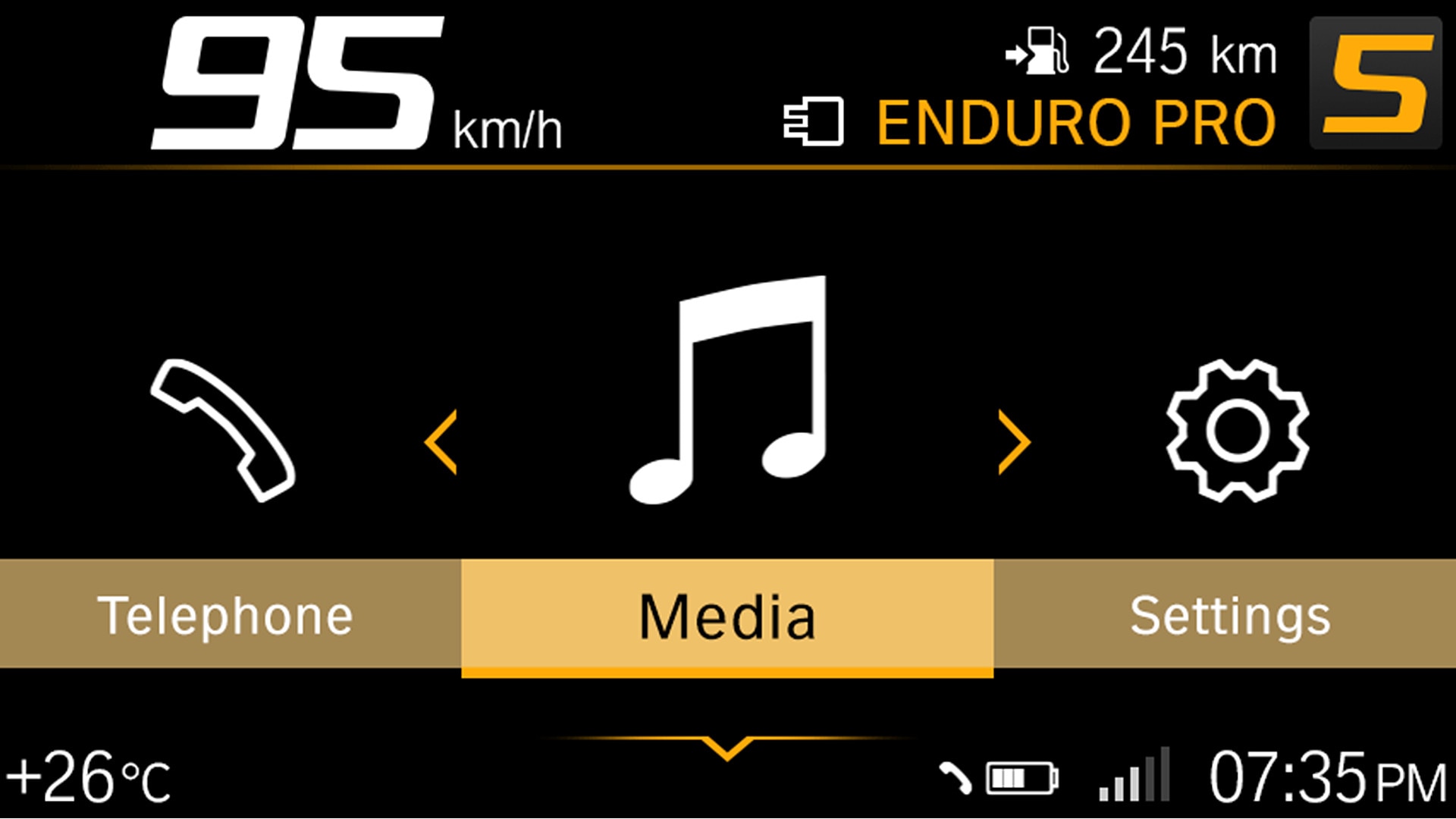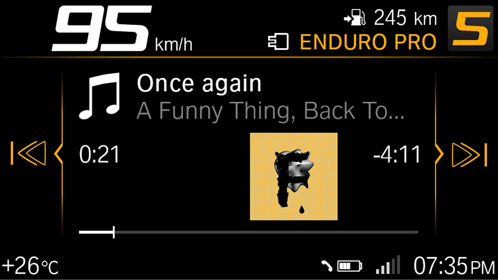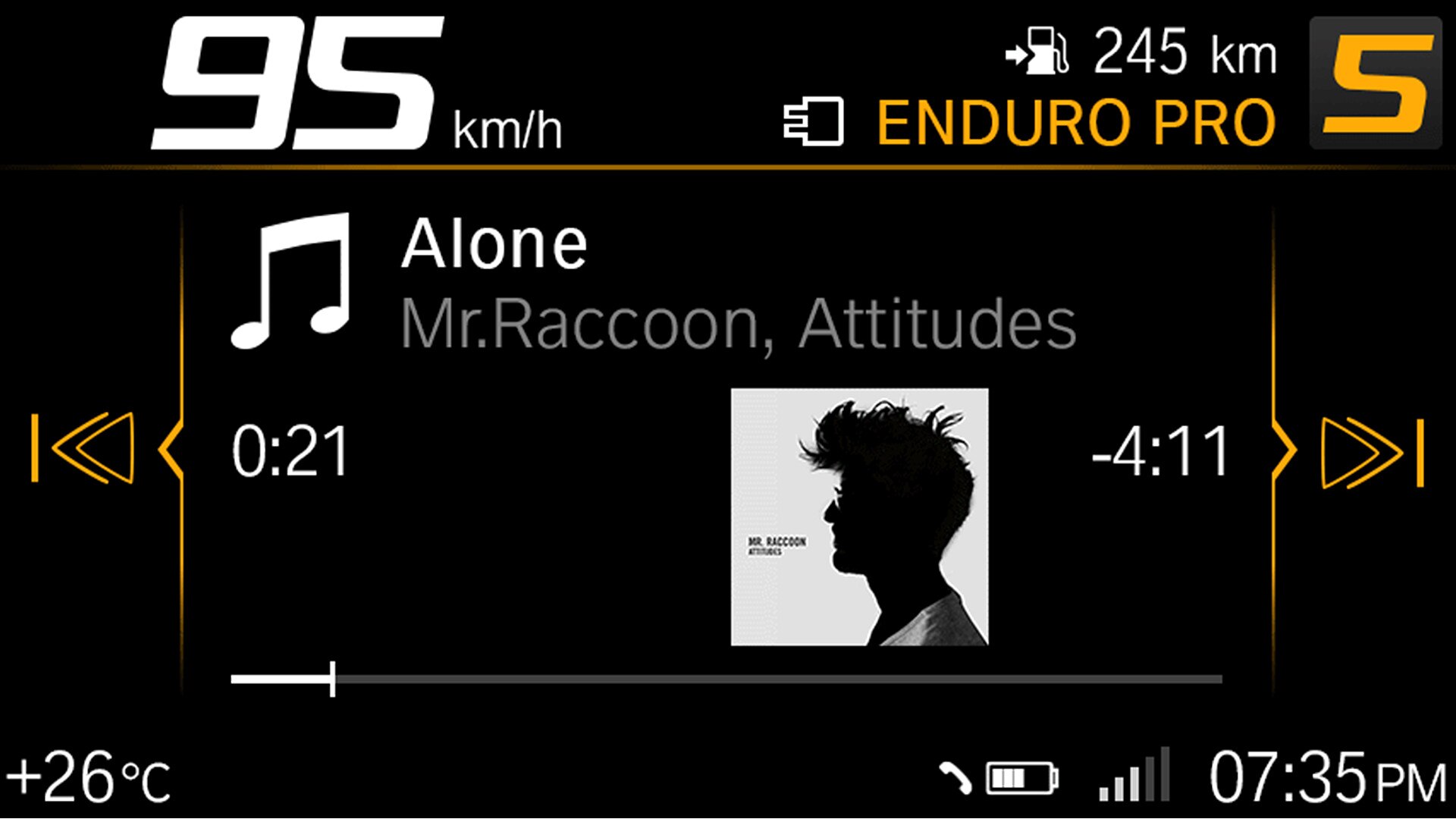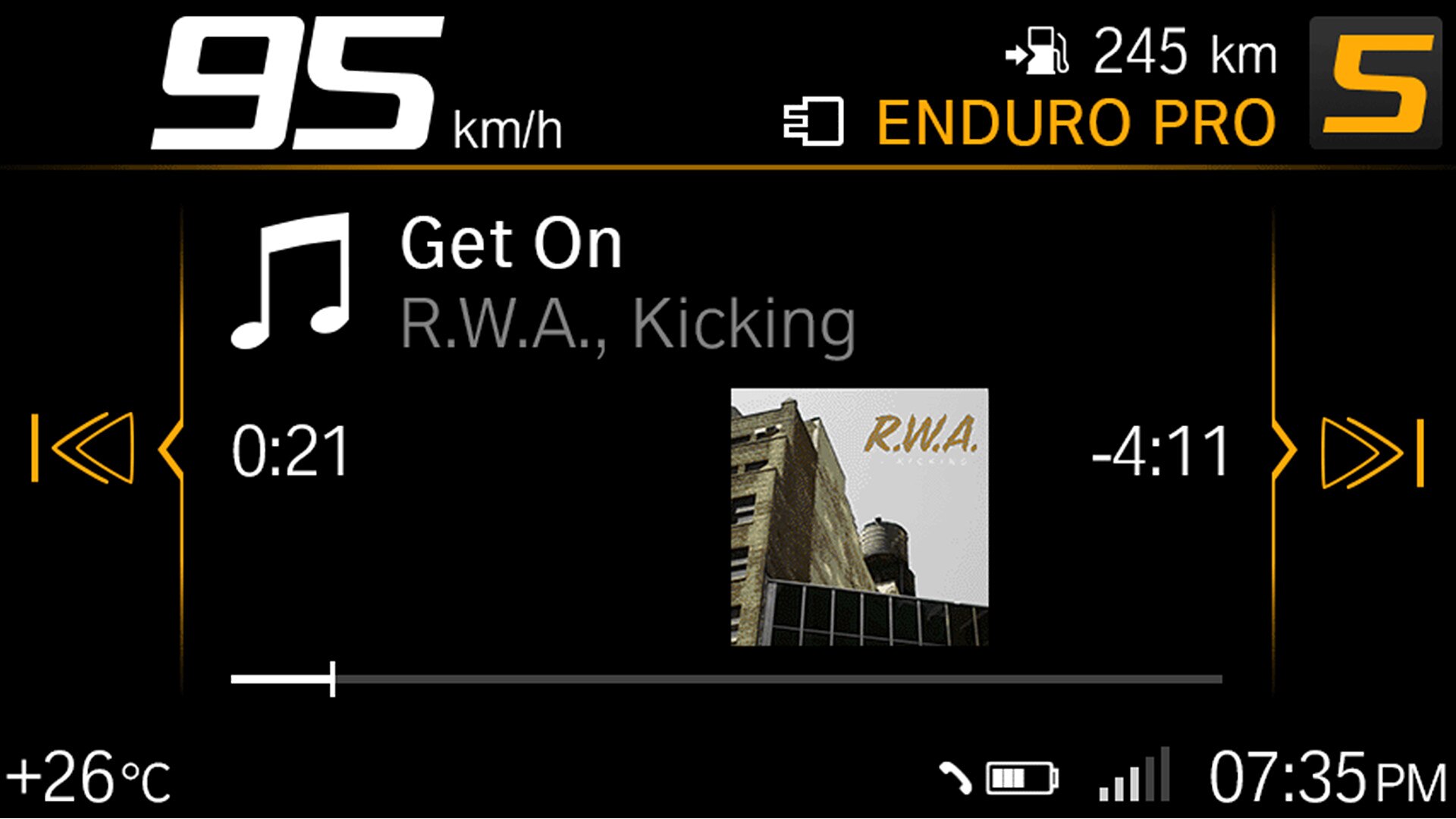 You can easily play the music saved on your smartphone via the TFT-display using the Connectivity optional accessory. Having your helmet connected to the BMW Motorrad communications system ensures you get the perfect tone. If you don't like a particular track, you have direct access to the skip forward/skip back functions. With the BMW Motorrad communications system, you can also easily adjust the volume - and also the mute function- via the multi-controller. So that every rider has control of their soundtrack en route.