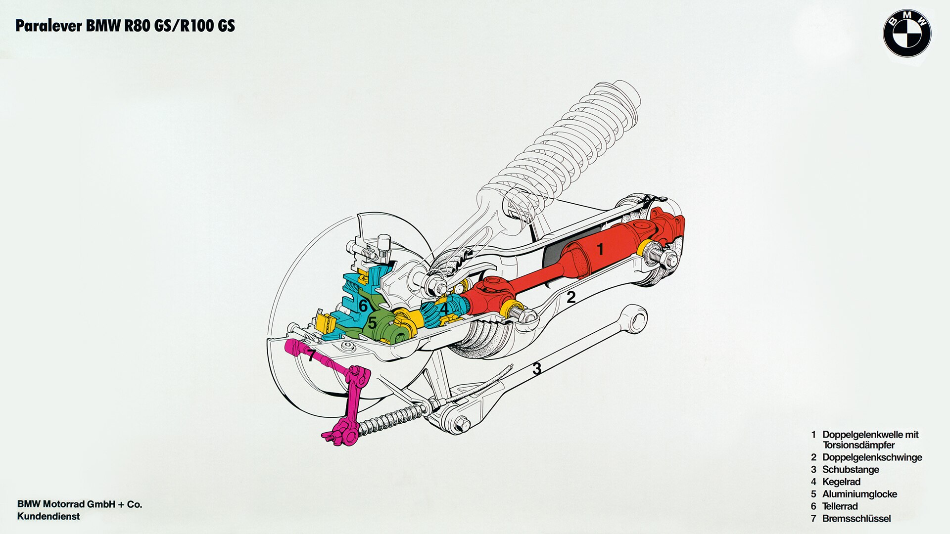 Technically identical to the R 100 GS, the small GS had a paralever rocker with torque support, cross-spoked wheels and a 24-litre fuel tank.