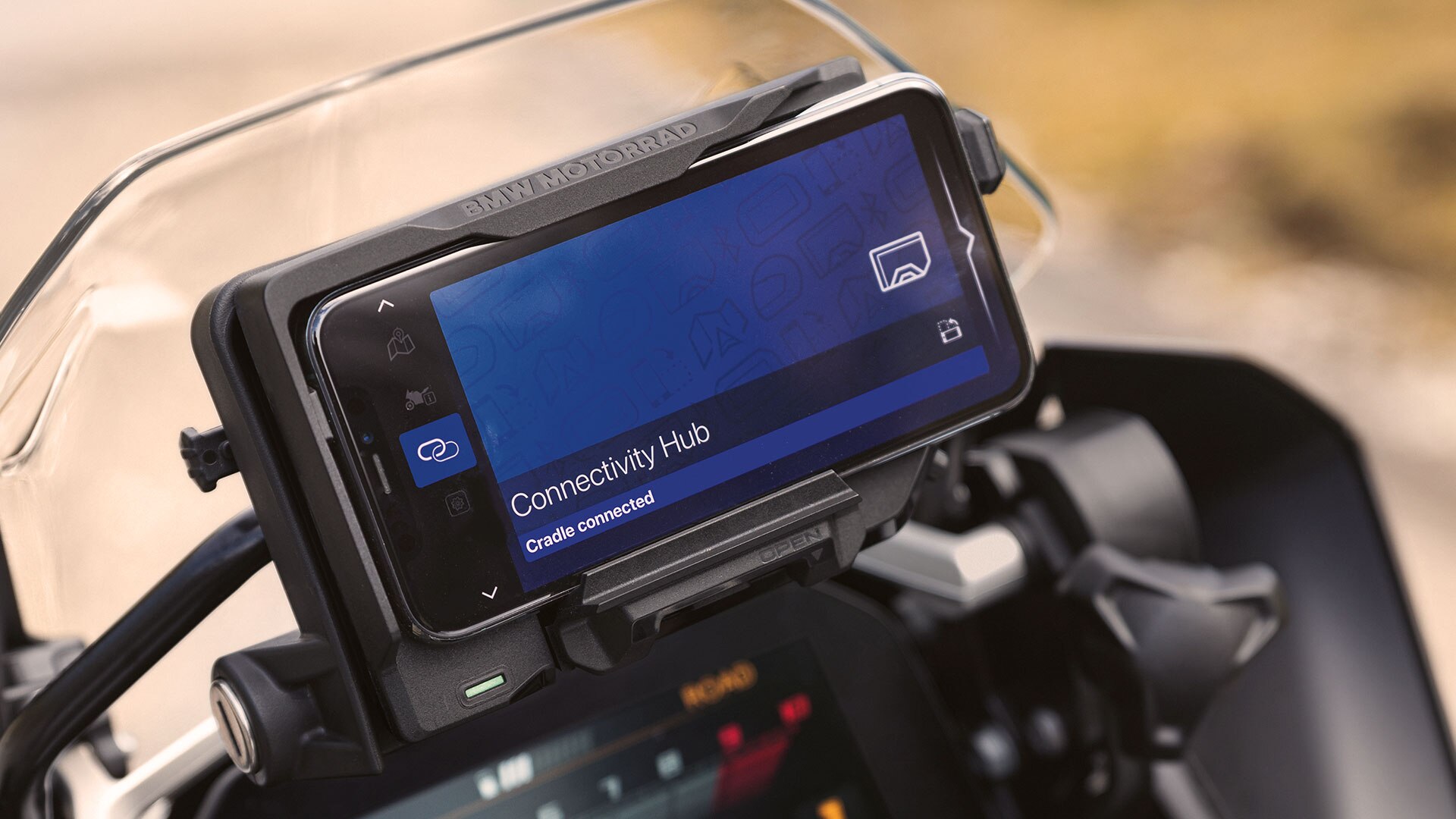 If you are out on your motorcycle and don’t want to go without your smartphone, the BMW Motorrad ConnectedRide Cradle is just the thing for you. You pair the smartphone using the BMW Motorrad Connected app, place it in the holder and you’re ready to go. Safely and conveniently control the device using the Multi-Controller on the handlebars. And with the ConnectedRide Com U1 system, we have a smart solution for everyone who wants to talk to their passengers while riding.